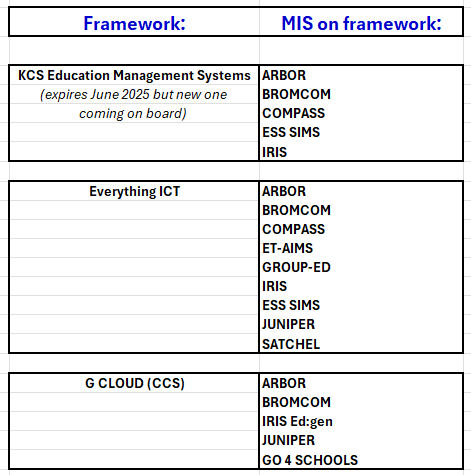 Existing frameworks that the DfE currently recommends are G-Cloud, KCS (Kent County Supplies) and Everything ICT, but not all MIS suppliers are on every framework.