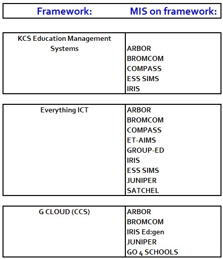 Existing frameworks that the DfE currently recommends are G-Cloud, KCS (Kent County Supplies) and Everything ICT, but not all MIS suppliers are on every framework.