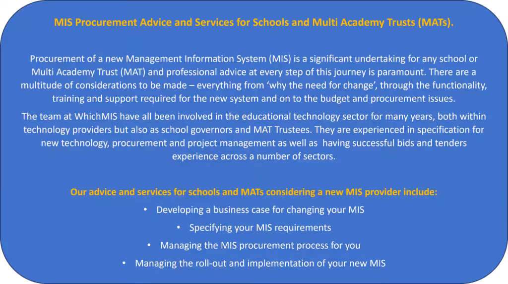 WhichMIS? recently launched a new service for Schools and MATs – please let us know if you’d like more information or to book a no obligation call to discuss MIS procurement.