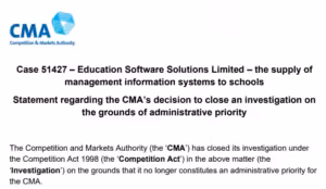The CMA (Competition and Markets Authority) have decided to close their investigation into concerns that ESS (Education Software Solutions) may have broken the law by taking action to prevent schools from switching from their SIMS software to an alternative MIS (Management Information System) provider.