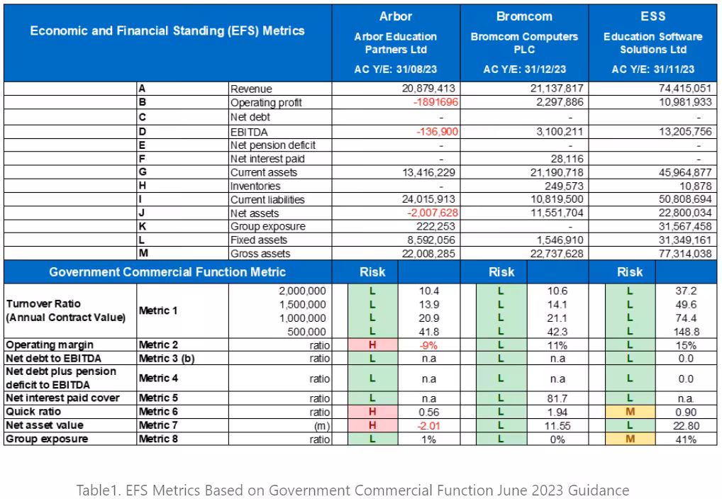 Surprisingly, when assessing the EFS risks against the government commercial function metrics, only Bromcom are rated as ‘Low Risk’ across all eleven EFS areas. In contrast, ESS SIMS have two areas rated as ‘Medium Risk’ whilst Arbor have three areas rated as ‘High Risk’: